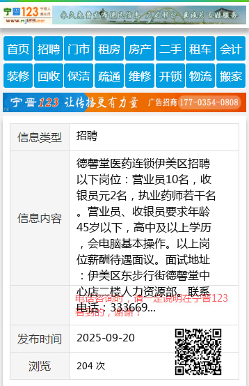 德馨堂医药连锁伊美区招聘以下岗位:营业员10名,收银员元2名,执业药师若干名。营业员、收银员要求年龄45岁以下,高中及以上学历,会电脑基本操作。以上岗位薪酬待遇面议。面试地址:伊美区东步行街德馨堂中心店二楼人力资源部。联系电话:3336692或18324651141冯女士18324651141 【电话咨询时,请一定说明在伊春信息网看到的,谢谢!】 |
