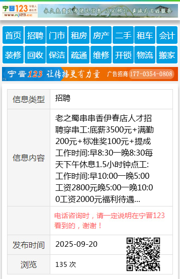 老之蜀串串香伊春店人才招聘穿串工:底薪3500元+满勤200元+标准奖100元+提成工作时间:早8:30一晚8:30每天下午休息1.5小时钟点工:工作时间:早10:00一晚5:00工资2800元晚5:00一晚10:00工资2000元福利待遇:1、每月带薪休息2天(1整天+2半天)2、免费提供员工餐3、每年工龄工资4、年终奖工作地点:伊春黑大东门对面电话:1563640171813149583033董女士15636401718 【电话咨询时,请一定说明在伊春信息网看到的,谢谢!】 |