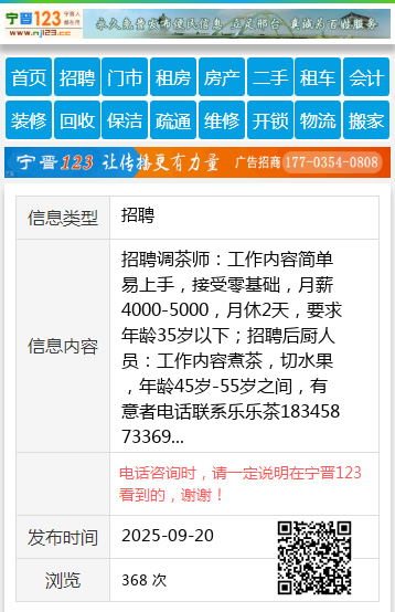 招聘调茶师:工作内容简单易上手,接受零基础,月薪4000-5000,月休2天,要求年龄35岁以下;招聘后厨人员:工作内容煮茶,切水果,年龄45岁-55岁之间,有意者电话联系乐乐茶18345873369 【电话咨询时,请一定说明在伊春信息网看到的,谢谢!】 |
