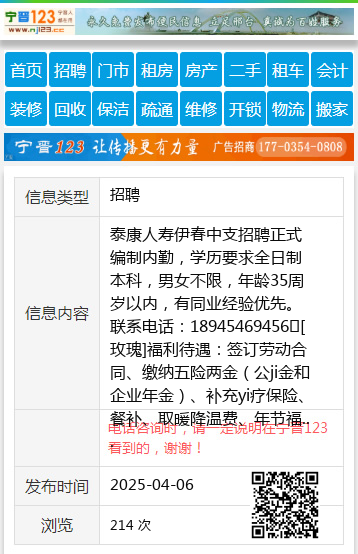 泰康人寿伊春中支招聘正式编制内勤,学历要求全日制本科,男女不限,年龄35周岁以内,有同业经验优先。联系电话:18945469456[玫瑰]福利待遇:签订劳动合同、缴纳五险两金(公ji金和企业年金)、补充yi疗保险、餐补、取暖降温费、年节福利,带薪年休假、免费体检等。张女士18945469456 【电话咨询时,请一定说明在伊春信息网看到的,谢谢!】 |