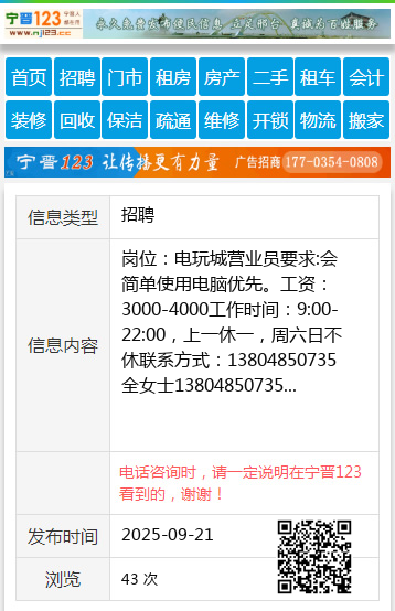 岗位:电玩城营业员要求:会简单使用电脑优先。工资:3000-4000工作时间:9:00-22:00,上一休一,周六日不休联系方式:13804850735全女士13804850735 【电话咨询时,请一定说明在伊春信息网看到的,谢谢!】 |