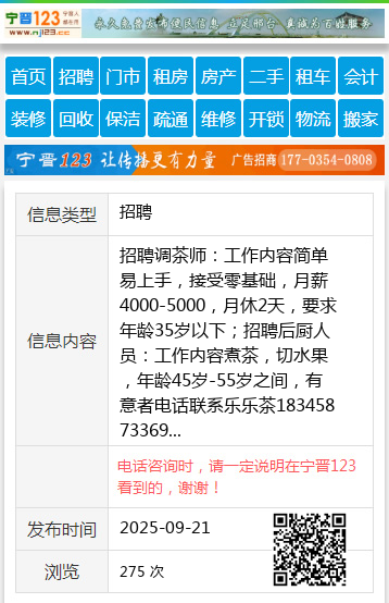 招聘调茶师:工作内容简单易上手,接受零基础,月薪4000-5000,月休2天,要求年龄35岁以下;招聘后厨人员:工作内容煮茶,切水果,年龄45岁-55岁之间,有意者电话联系乐乐茶18345873369 【电话咨询时,请一定说明在伊春信息网看到的,谢谢!】 |