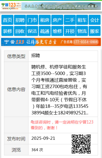 聘机修、机修学徒和服务生工资3500--5000,实习期3个月考核通过直接晋级,实习期工资2700包吃包住,有电工和汽电经验者优先,月带薪假4-10天(节假日不休)年龄18--35岁电话13354538994颜女士18249892521 【电话咨询时,请一定说明在伊春信息网看到的,谢谢!】 |