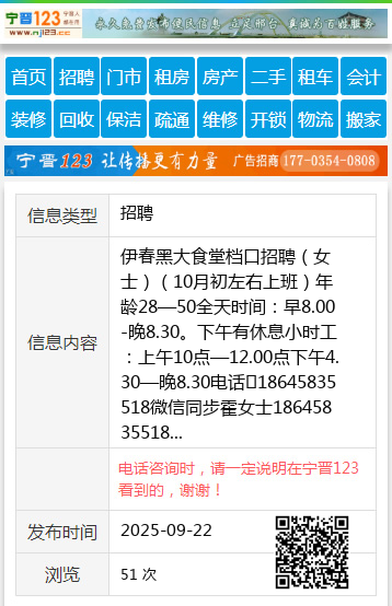 伊春黑大食堂档口招聘(女士)(10月初左右上班)年龄28—50全天时间:早8.00-晚8.30。下午有休息小时工:上午10点—12.00点下午4.30—晚8.30电话☎18645835518微信同步霍女士18645835518 【电话咨询时,请一定说明在伊春信息网看到的,谢谢!】 |