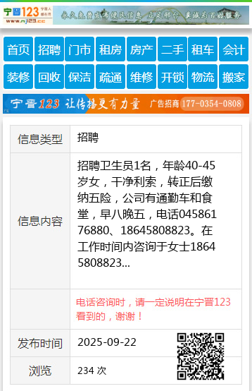 招聘卫生员1名,年龄40-45岁女,干净利索,转正后缴纳五险,公司有通勤车和食堂,早八晚五,电话04586176880、18645808823。在工作时间内咨询于女士18645808823 【电话咨询时,请一定说明在伊春信息网看到的,谢谢!】 |