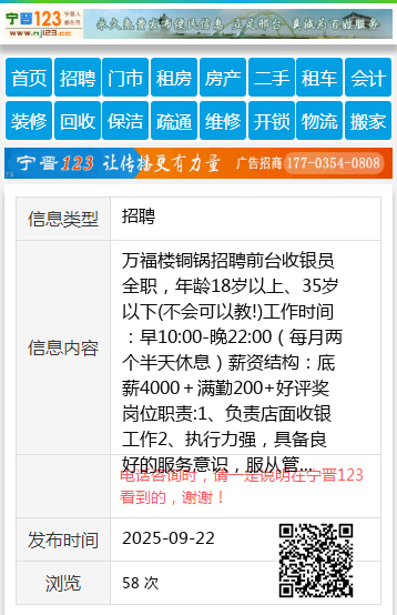 万福楼铜锅招聘前台收银员全职,年龄18岁以上、35岁以下(不会可以教!)工作时间:早10:00-晚22:00(每月两个半天休息)薪资结构:底薪4000+满勤200+好评奖岗位职责:1、负责店面收银工作2、执行力强,具备良好的服务意识,服从管理和安排3、积极主动,具备良好的沟通表达,良好的吃苦耐劳精神4、手脚麻利,忙的时候要有点基础抗压能力(就正餐高峰期会比较忙)地址:亲水家园3期鱼米有机厨房对面电话:18565204050与微信同步郭先生18645870960 【电话咨询时,请一定说明在伊春信息网看到的,谢谢!】 |