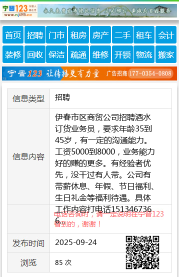 伊春市区商贸公司招聘酒水订货业务员,要求年龄35到45岁,有一定的沟通能力。工资5000到8000,业务能力好的赚的更多。有经验者优先,没干过有人带。公司有带薪休息、年假、节日福利、生日礼金等福利待遇。具体工作内容打电话15134673666丁女士18645810567 【电话咨询时,请一定说明在伊春信息网看到的,谢谢!】 |
