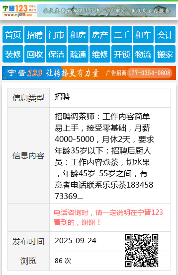 招聘调茶师:工作内容简单易上手,接受零基础,月薪4000-5000,月休2天,要求年龄35岁以下;招聘后厨人员:工作内容煮茶,切水果,年龄45岁-55岁之间,有意者电话联系乐乐茶18345873369 【电话咨询时,请一定说明在伊春信息网看到的,谢谢!】 |