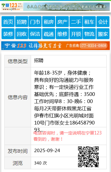 年龄18-35岁,身体健康;具有良好的沟通能力与服务意识;有一定快递行业工作基础优先;底薪待遇:3500工作时间早8:30-晚6:00每月2天带薪休假黑龙江省伊春市红旗小区光明城对面10号门市张女士18645879093