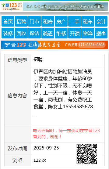 伊春区内加油站招聘加油员,要求身体健康,年龄60岁以下,性别不限,无不良嗜好,上一天一宿,休息一天一宿,两班倒,有免费职工食堂,陈女士16554585678 【电话咨询时,请一定说明在伊春信息网看到的,谢谢!】 |