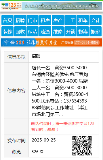 后厨工人一名:薪资2500-3000.