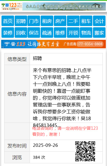 来个有意思的招聘.上八点半下六点半早班,晚班上中午十一点到晚上八点!我要聪明勤快的!靠谱一点能盯事的,你觉得你可以做蛋糕加管理店里一些事联系我,告诉我你想要多少工资你能做啥,我觉得行你就来!吴18845813445 【电话咨询时,请一定说明在伊春信息网看到的,谢谢!】 |