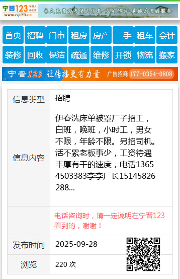 伊春洗床单被罩厂子招工,白班,晚班,小时工,男女不限,年龄不限。另招司机。活不累老板事少,工资待遇丰厚有干的速度,电话13654503383李李厂长15145826288 【电话咨询时,请一定说明在伊春信息网看到的,谢谢!】 |
