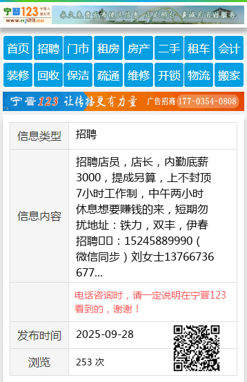 招聘店员,店长,内勤底薪3000,提成另算,上不封顶7小时工作制,中午两小时休息想要赚钱的来,短期勿扰地址:铁力,双丰,伊春招聘☎️:15245889990(微信同步)刘女士13766736677 【电话咨询时,请一定说明在伊春信息网看到的,谢谢!】 |