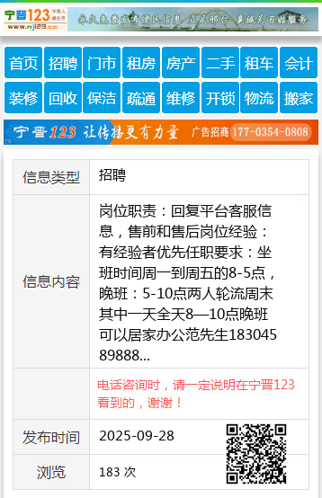 岗位职责:回复平台客服信息,售前和售后岗位经验:有经验者优先任职要求:坐班时间周一到周五的8-5点,晚班:5-10点两人轮流周末其中一天全天8—10点晚班可以居家办公范先生18304589888 【电话咨询时,请一定说明在伊春信息网看到的,谢谢!】 |