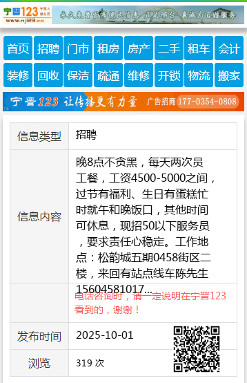 晚8点不贪黑,每天两次员工餐,工资4500-5000之间,过节有福利、生日有蛋糕忙时就午和晚饭口,其他时间可休息,现招50以下服务员,要求责任心稳定。工作地点:松韵城五期0458街区二楼,来回有站点线车陈先生15604581017 【电话咨询时,请一定说明在伊春信息网看到的,谢谢!】 |