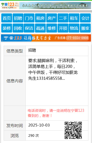 要求;腿脚麻利,干活利索,活简单易上手,每日200,中午供饭,干得好可加薪龙先生13314585558