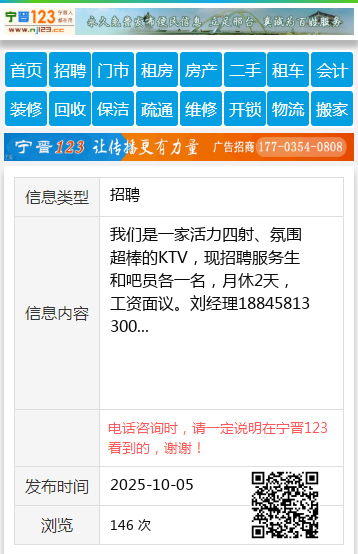 我们是一家活力四射、氛围超棒的KTV,现招聘服务生和吧员各一名,月休2天,工资面议。刘经理18845813300