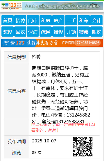 明辉口腔招聘口腔护士,底薪3000,缴纳五险,另有业绩提成,月休4天,五一、十一有串休,要求有护士证,长期稳定,有口腔工作经验优先,无经验可培养,地址:伊春二道街明辉口腔门诊,电话/微信:13124588281。蒲经理13124588281 【电话咨询时,请一定说明在伊春信息网看到的,谢谢!】 |