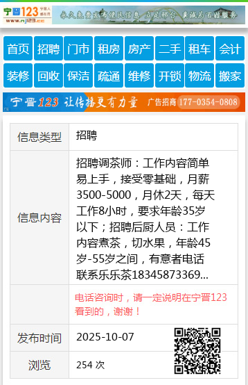 招聘调茶师:工作内容简单易上手,接受零基础,月薪3500-5000,月休2天,每天工作8小时,要求年龄35岁以下;招聘后厨人员:工作内容煮茶,切水果,年龄45岁-55岁之间,有意者电话联系乐乐茶18345873369 【电话咨询时,请一定说明在伊春信息网看到的,谢谢!】 |