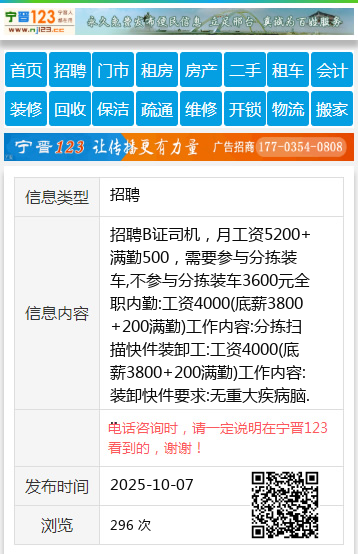招聘B证司机,月工资5200+满勤500,需要参与分拣装车,不参与分拣装车3600元全职内勤:工资4000(底薪3800+200满勤)工作内容:分拣扫描快件装卸工:工资4000(底薪3800+200满勤)工作内容:装卸快件要求:无重大疾病脑梗心梗心脏病等工作地点:汇源展厅对面。联系电话:13766789712王经理15304580178 【电话咨询时,请一定说明在伊春信息网看到的,谢谢!】 |