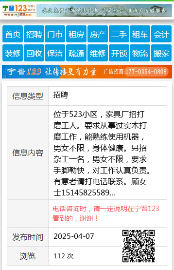 位于523小区,家具厂招打磨工人。要求从事过实木打磨工作,能熟练使用机器,男女不限,身体健康。另招杂工一名,男女不限,要求手脚勒快,对工作认真负责。有意者请打电话联系。顾女士15145825589 【电话咨询时,请一定说明在伊春信息网看到的,谢谢!】 |