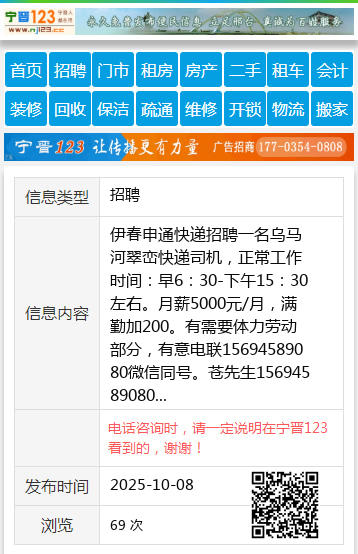 伊春申通快递招聘一名乌马河翠峦快递司机,正常工作时间:早6:30-下午15:30左右。月薪5000元/月,满勤加200。有需要体力劳动部分,有意电联15694589080微信同号。苍先生15694589080 【电话咨询时,请一定说明在伊春信息网看到的,谢谢!】 |