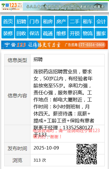 连锁药店招聘营业员,要求女,50岁以内,有经验者年龄放宽至55岁。亲和力强,责任心强,服务意识高。工作地点:邮电大厦附近,工作时间:8小时倒班制,月休四天。薪资待遇:底薪+提成+工龄工资+保险有意者联系于经理:13352580127于13352580127 【电话咨询时,请一定说明在伊春信息网看到的,谢谢!】 |