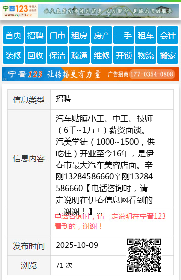 汽车贴膜小工、中工、技师(6千~1万+)薪资面谈。汽美学徒(1000~1500,供吃住)开业至今16年,是伊春市最大汽车美容店面。辛刚13284586660辛刚13284586660 【电话咨询时,请一定说明在伊春信息网看到的,谢谢!】 |