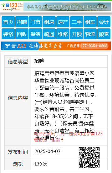 招聘启示伊春市溪语墅小区华鑫物业现诚聘各岗位员工,配备统一服装,免费提供午餐,环境优美,待遇优厚。(一)维修人员:招聘学徒工,要求吃苦耐劳,善于学习,年龄在18-35岁之间,无不良嗜好。(二)保安员:身体健康,无不良嗜好,有工作经验及退伍军人优先。(三)保洁员:要求身体健康、工作认真,吃苦耐劳。地址:伊春市林都-溪语墅小区联系电话:0458-695000013796509158(伊春市⻜⻰路和透⻰大街交叉口,消防支队⻄侧)武女士13796509158 【电话咨询时,请一定说明在伊春信息网看到的,谢谢!】 |