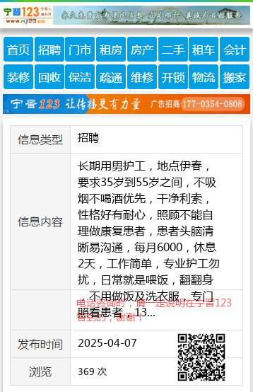 长期用男护工,地点伊春,要求35岁到55岁之间,不吸烟不喝酒优先,干净利索,性格好有耐心,照顾不能自理做康复患者,患者头脑清晰易沟通,每月6000,休息2天,工作简单,专业护工勿扰,日常就是喂饭,翻翻身,不用做饭及洗衣服,专门照看患者,13766759021李女士15245881000 【电话咨询时,请一定说明在伊春信息网看到的,谢谢!】 |