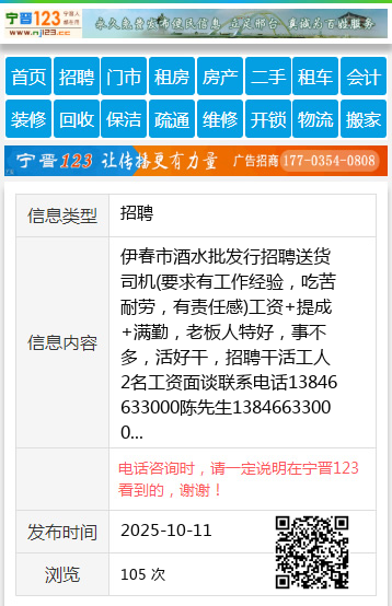 伊春市酒水批发行招聘送货司机(要求有工作经验,吃苦耐劳,有责任感)工资+提成+满勤,老板人特好,事不多,活好干,招聘干活工人2名工资面谈联系电话13846633000陈先生13846633000 【电话咨询时,请一定说明在伊春信息网看到的,谢谢!】 |