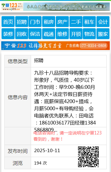 九珍十八品招聘导购要求:形象好,气质佳,40岁以下工作时间:早9:00-晚6:00月休两天+法定节假日薪资待遇:底薪保底4200+提成,月薪5000+有导购经验,会电脑者优先联系人:田电话:18610036177田经理13845868809 【电话咨询时,请一定说明在伊春信息网看到的,谢谢!】 |
