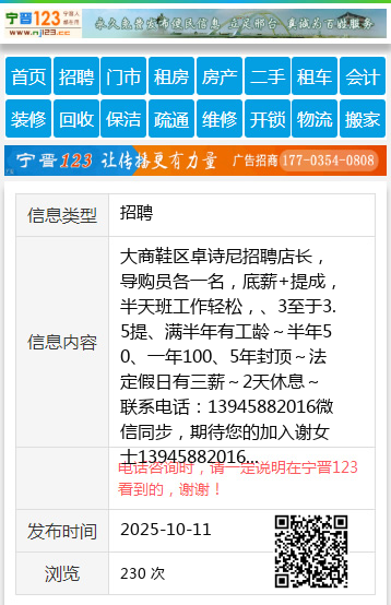 大商鞋区卓诗尼招聘店长,导购员各一名,底薪+提成,半天班工作轻松,、3至于3.5提、满半年有工龄~半年50、一年100、5年封顶~法定假日有三薪~2天休息~联系电话:13945882016微信同步,期待您的加入谢女士13945882016 【电话咨询时,请一定说明在伊春信息网看到的,谢谢!】 |
