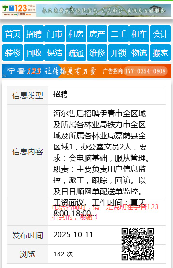 海尔售后招聘伊春市全区域及所属各林业局铁力市全区域及所属各林业局嘉荫县全区域1,办公室文员2人,要求:会电脑基础,服从管理。职责:主要负责用户信息监控,派工,跟踪,回访。以及日日顺网单配送单监控。工资面议。工作时间:夏天8:00-18:002,招聘送货司机若干人,要求:有多年驾驶货车经验,独立基础维护车辆。服从管理,按要求完成每日任务。职责:负责家电配送,带货安装。工作时间无限制,以时效完成率为准。工资:月入5000-8000元3,家电安装维修服务兵若干人。有经验者直接考证入岗。无经验,可免费培训后考证入岗。工作时间:无限制以服务用户为主。工资:月入5000-8000元(不算空调旺季,具体面谈)公司:伊春市沐宸商贸有限公司(铁力海尔)地址:铁力市愿景家园E1栋商服公司:黑龙江德允商贸有限公司(伊春海尔)地址:伊春市七公里海尔智家热线:16536402222热线:18645871444热线:0458-2297666热线:0458-3909999周经理18645871444 【电话咨询时,请一定说明在伊春信息网看到的,谢谢!】 |
