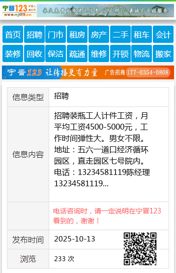招聘装瓶工人计件工资,月平均工资4500-5000元,工作时间弹性大。男女不限。地址:五六一道口经济循环园区,直走园区七号院内。电话:13234581119陈经理13234581119 【电话咨询时,请一定说明在伊春信息网看到的,谢谢!】 |