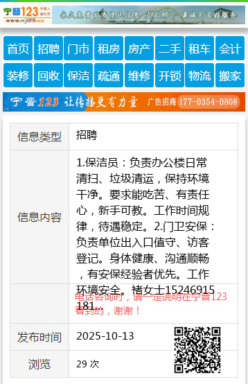 1.保洁员:负责办公楼日常清扫、垃圾清运,保持环境干净。要求能吃苦、有责任心,新手可教。工作时间规律,待遇稳定。2.门卫安保:负责单位出入口值守、访客登记。身体健康、沟通顺畅,有安保经验者优先。工作环境安全。褚女士15246915181 【电话咨询时,请一定说明在伊春信息网看到的,谢谢!】 |