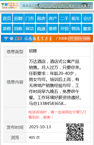 万达酒店,酒店式公寓产品销售。月入过万,只要你来。任职要求:年龄20-40岁,男女均可。培训后上岗,有无房地产销售经验均可,工作时间早九晚五,免费供午餐。工作环境好薪资待遇好。马总13384583658 【电话咨询时,请一定说明在伊春信息网看到的,谢谢!】 |