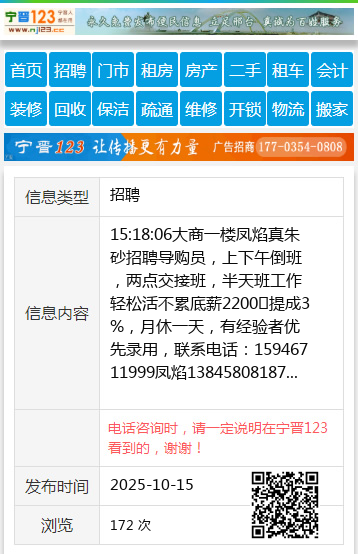 15:18:06大商一楼凤焰真朱砂招聘导购员,上下午倒班,两点交接班,半天班工作轻松活不累底薪2200➕提成3%,月休一天,有经验者优先录用,联系电话:15946711999凤焰13845808187 【电话咨询时,请一定说明在伊春信息网看到的,谢谢!】 |