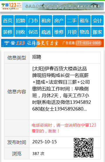 [太阳]伊春百货大楼森达品牌现招导购或长促一名底薪+提成+法定假日三薪+公司缴纳五险工作时间:早晚倒班,月休2天,每天工作7小时联系电话及微信13945892680赵女士13945892680 【电话咨询时,请一定说明在伊春信息网看到的,谢谢!】 |