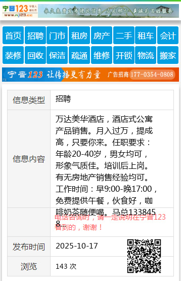 万达美华酒店,酒店式公寓产品销售。月入过万,提成高,只要你来。任职要求:年龄20-40岁,男女均可,形象气质佳。培训后上岗。有无房地产销售经验均可。工作时间:早9:00-晚17:00,免费提供午餐,伙食好,咖啡奶茶随便喝。马总13384583658 【电话咨询时,请一定说明在伊春信息网看到的,谢谢!】 |