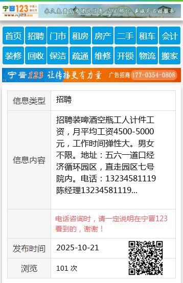 招聘装啤酒空瓶工人计件工资,月平均工资4500-5000元,工作时间弹性大。男女不限。地址:五六一道口经济循环园区,直走园区七号院内。电话:13234581119陈经理13234581119 【电话咨询时,请一定说明在伊春信息网看到的,谢谢!】 |