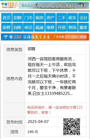 河西一宾馆招客房服务员,现在每天一上午活,收拾完就可以下班,下午休息,十月一之后每天俩小时活,干完就可以下班,一年就忙两个月,要求干净,有意者联系.白女士13339485225