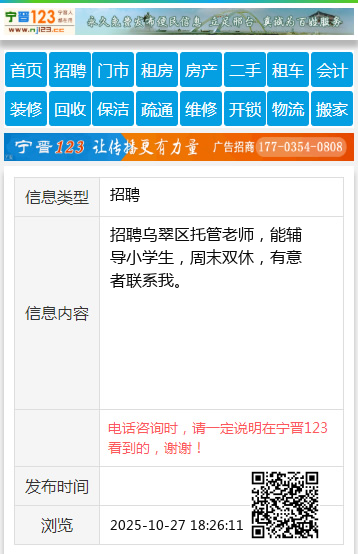 招聘乌翠区托管老师,能辅导小学生,周末双休,有意者联系我。