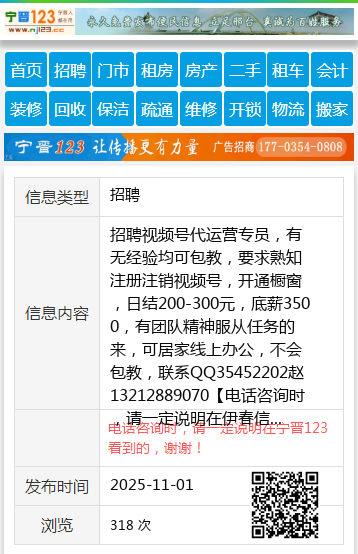 招聘视频号代运营专员,有无经验均可包教,要求熟知注册注销视频号,开通橱窗,日结200-300元,底薪3500,有团队精神服从任务的来,可居家线上办公,不会包教,联系QQ35452202赵13212889070 【电话咨询时,请一定说明在伊春信息网看到的,谢谢!】 |