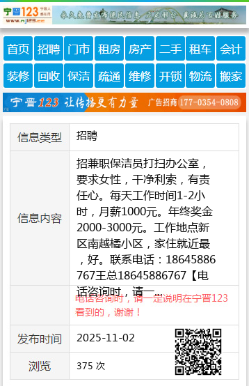 招兼职保洁员打扫办公室,要求女性,干净利索,有责任心。每天工作时间1-2小时,月薪1000元。年终奖金2000-3000元。工作地点新区南越橘小区,家住就近最,好。联系电话:18645886767王总18645886767 【电话咨询时,请一定说明在伊春信息网看到的,谢谢!】 |