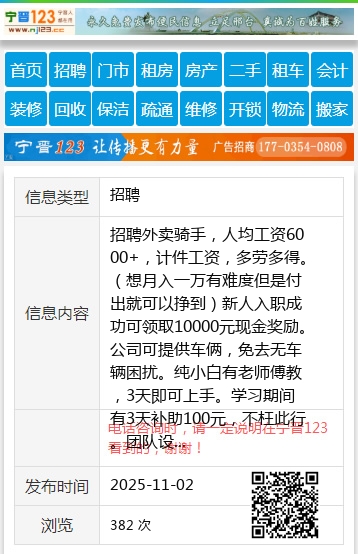 招聘外卖骑手,人均工资6000+,计件工资,多劳多得。(想月入一万有难度但是付出就可以挣到)新人入职成功可领取10000元现金奖励。公司可提供车俩,免去无车辆困扰。纯小白有老师傅教,3天即可上手。学习期间有3天补助100元,不枉此行。团队设有多项福利政策:1:冲单奖励2:排位奖金3:满勤奖励4:好评奖励5:冬季补助6:超重奖励张女士18604585727 【电话咨询时,请一定说明在伊春信息网看到的,谢谢!】 |