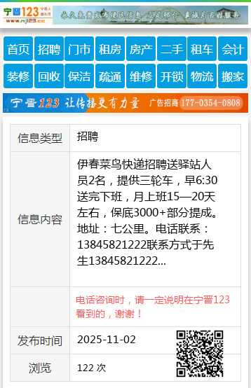 伊春菜鸟快递招聘送驿站人员2名,提供三轮车,早6:30送完下班,月上班15—20天左右,保底3000+部分提成。地址:七公里。电话联系:13845821222联系方式于先生13845821222 【电话咨询时,请一定说明在伊春信息网看到的,谢谢!】 |