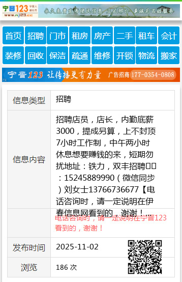 招聘店员,店长,内勤底薪3000,提成另算,上不封顶7小时工作制,中午两小时休息想要赚钱的来,短期勿扰地址:铁力,双丰招聘☎️:15245889990(微信同步)刘女士13766736677 【电话咨询时,请一定说明在伊春信息网看到的,谢谢!】 |