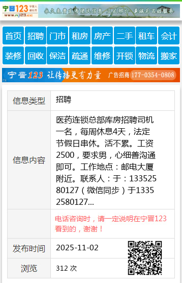 医药连锁总部库房招聘司机一名,每周休息4天,法定节假日串休。活不累。工资2500,要求男,心细善沟通即可。工作地点:邮电大厦附近。联系人:于:13352580127(微信同步)于13352580127 【电话咨询时,请一定说明在伊春信息网看到的,谢谢!】 |